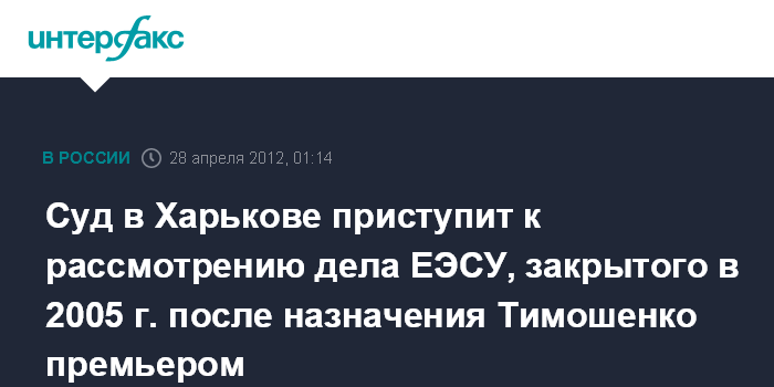 Киев. 28 апреля. ИНТЕРФАКС-УКРАИНА - Киевский районный суд Харькова начнет в субботу слушание по существу уголовного дела по обвинению экс-премьера Юлии Тимошенко в преступлениях в связи с деятельностью корпорации "Единые энергетические системы Украины" (ЕЭСУ).