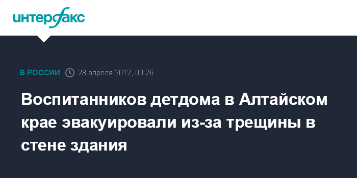 Барнаул. 28 апреля. INTERFAX.RU - Рабочая комиссия в Алтайском крае расследует причины появления трещины в стене детского дома №1 в Горняке, сообщил в субботу агентству "Интерфакс-Сибирь" представитель краевого управления по образованию и делам молодежи.