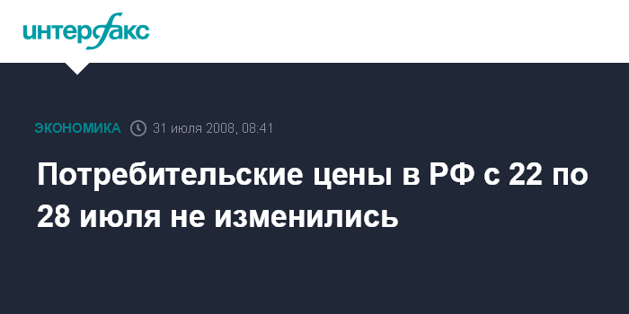 Москва. 31 июля. INTERFAX.RU - Потребительские цены в РФ с 22 по 28 июля не изменились, с начала месяца инфляция составила 0,5%, сообщил Росстат.