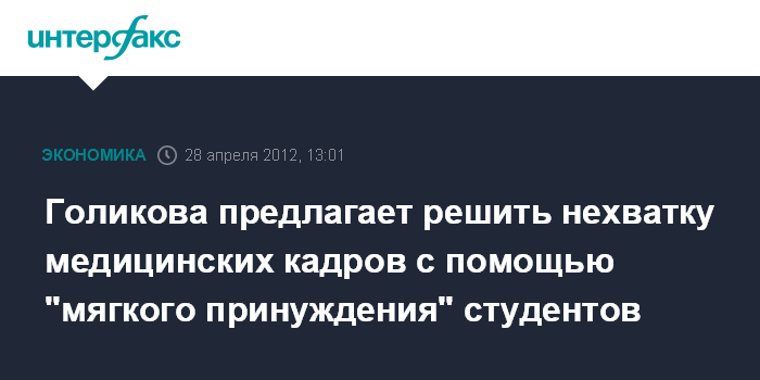 "Мы должны будем предлагать некие, если хотите, мягкие принудительные меры для того, чтобы студенты все-таки ехали работать в отдаленные населенные пункты", - заявила глава Минздравсоцразвития Татьяна Голикова на совещании у премьера РФ Владимира Путина, посвященном реализации задач, поставленных в его предвыборной статье "Строительство справедливости. Социальная политика России".