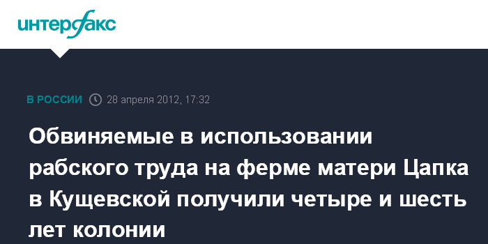 Краснодар. 28 апреля. INTERFAX.RU - Кущевский районный суд Краснодарского края вынес приговор Марине Дан и Николаю Щербакову, которые обвинялись в использовании рабского труда на предприятии матери Сергея Цапка "Артекс-Агро".