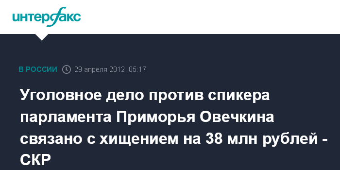 Уголовное дело против спикера парламента Приморья Овечкина связано с хищением на 38 млн рублей - СКР