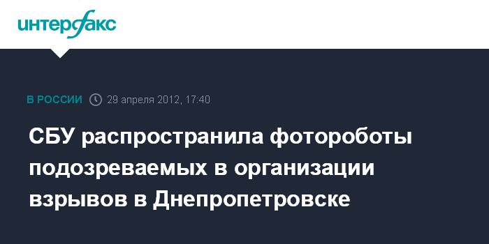 Днепропетровск. 29 апреля. INTERFAX.RU - Служба безопасности Украины составила фотороботы троих разыскиваемых по подозрению во взрывах с Днепропетровске 27 апреля. Фотороботы распространила в воскресенье пресс-группа УСБУ в Днепропетровской области.