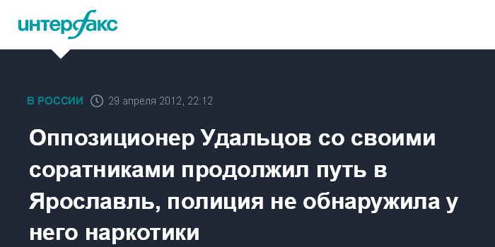 Ярославль. 29 апреля. ИНТЕРФАКС-ЦЕНТР – Координатор «Левого фронта» Сергей Удальцов отпущен из полиции и вместе со своими соратниками продолжил путь в Ярославль, сообщили агентству «Интерфакс – Центр» в РОВД Переславского района Ярославской области.