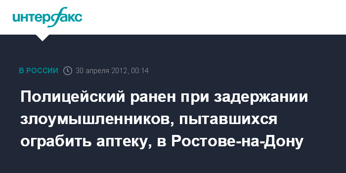Москва. 30 апреля. ИНТЕРФАКС - В Ростовской области задержаны трое молодых людей, пытавшихся ограбить аптеку и ранивших из травматического оружия при задержании полицейского, сообщили "Интерфаксу" в правоохранительных органах.