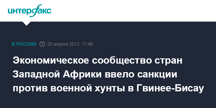 Каир. 30 апреля. INTERFAX.RU - Экономическое сообщество стран Западной Африки (ЭКОВАС) ввело ограничительные меры против военных, захвативших власть в Гвинее-Бисау.