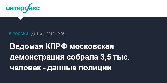Москва. 1 мая. INTERFAX.RU - Около 3,5 тысяч человек принимают участие в акции коммунистов и других движений в центре Москвы, сообщили "Интерфаксу" в пресс-службе ГУ МВД России по Москве. "В шествии, организованном КПРФ, "Движением в поддержку Армии", "Союзом Советских офицеров", женским движением "Надежда России", "Трудовой Россией", Союзом Коммунистической молодежи, Евразийским союзом молодежи и ряда других движений, принимают участие 3,5 тысячы человек", - сказал собеседник агентства.