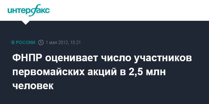 Москва. 1 мая. INTERFAX.RU - Федерация независимых профсоюзов России (ФНПР) завершила общероссийскую первомайскую акцию, в которой, по предварительным оценкам, приняло участие около 2,5 млн человек, сообщил секретарь ФНПР Александр Шершуков "Интерфаксу". Крупнейшей демонстрацией стало шествие в Москве, в которой, по оценкам полиции и оргкомитета акции, приняло участие около 150 тыс. человек. ФНПР является крупнейшим российским профобъединением, в членских организациях которого состоит около 22 млн человек.