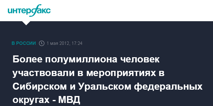Москва. 1 мая. INTERFAX.RU - Более 550 тыс. человек приняли участие в первомайских акциях в Сибирском и Уральском федеральных округах, мероприятия прошли без происшествий, сообщили "Интерфаксу" во вторник в пресс-центре МВД РФ.