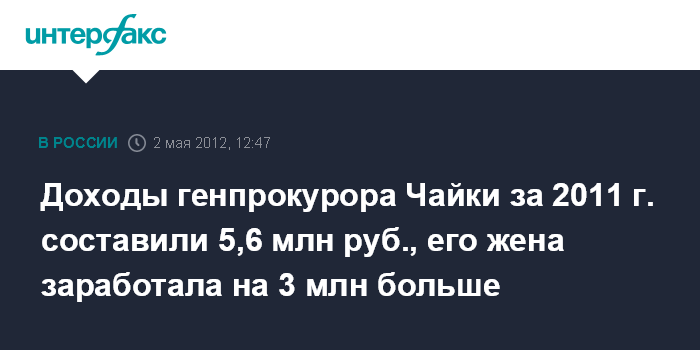 Доходы генпрокурора Чайки за 2011 г. составили 5,6 млн руб., его жена заработала на 3 млн больше