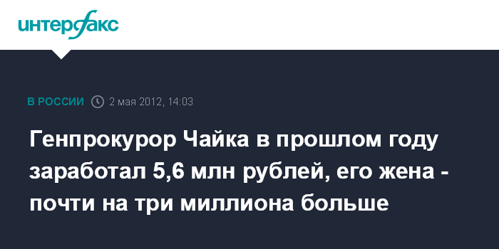 Москва. 2 мая. INTERFAX.RU - Генеральный прокурор России Юрий Чайка заработал в прошлом году 5 млн 643 тыс. 681 рубль, в пользовании у него квартира площадью 203 кв. метра, а также два раритетных автомобиля: ГАЗ-13 ("Чайка") и внедорожник ГАЗ-69.