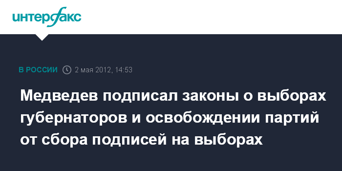 Горки. 2 мая. INTERFAX.RU - Президент РФ Дмитрий Медведев сообщил, что подписал законы о новом порядке выборов губернаторов РФ, а также об освобождении политических партий от необходимости собирать подписи.