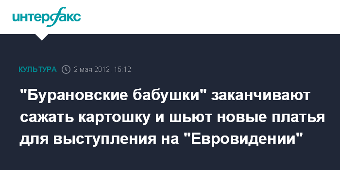Ижевск. 2 мая. INTERFAX.RU - "Бурановские бабушки" заканчивают подготовку к выступлению на конкурсе "Евровидение-2012": проводят репетиции в родном селе Бураново, примеривают специальные легкие национальные удмуртские платья и готовятся передать в руки соседей и родственников свои хозяйства.