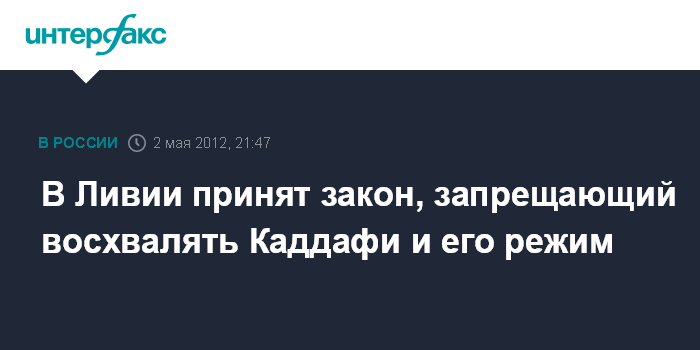 Каир. 2 мая. INTERFAX.RU - Находящийся у власти в Ливии Национальный переходный совет (НПС) в среду объявил о принятии закона, предусматривающего введение уголовной ответственности за восхваление бывшего лидера страны Муамара Каддафи и его режима, сообщили местные власти.