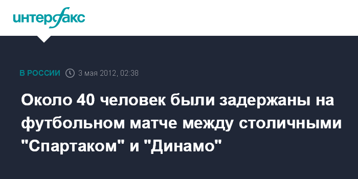 Москва. 3 мая. ИНТЕРФАКС - Сотрудники московской полиции задержали 38 болельщиков на футбольном матче между столичными клубами "Спартак" и "Динамо".