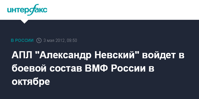 Москва. 3 мая. INTERFAX.RU - Атомный подводный ракетоносец проекта 955 "Борей" "Александр Невский" сможет выйти на заводские ходовые испытания не раньше сентября, принять его в боевой состав российского ВМФ планируется в октябре, сообщили "Интерфаксу-АВН" в Главном штабе Военно-морского флота в четверг.