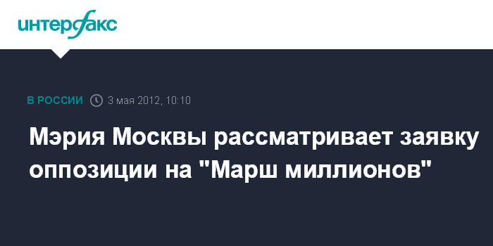 Москва. 3 мая. INTERFAX.RU- Мэрия Москвы рассматривает заявку оппозиции на проведение 6 мая так называемого "Марша миллионов" по улице Якиманка до Болотной площади, это предложение не отвергнуто, ведется работа по его реализации, заявил "Интерфаксу" в четверг руководитель департамента региональной безопасности Москвы Алексей Майоров.