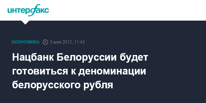 Минск. 3 мая. INTERFAX.RU - Национальный банк Белоруссии в 2013 г. планирует начать подготовку к деноминации белорусского рубля, конкретные сроки которой не определены, заявила председатель правления Нацбанка Белоруссии Надежда Ермакова, выступая в четверг в парламенте.