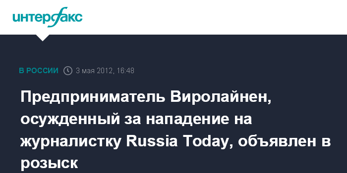 Санкт-Петербург. 3 мая. INTERFAX.RU - Петербургский предприниматель Сергей Виролайнен, осужденный за нападение на редактора канала Russia Today Наталью Архипцеву, проигнорировал судебное решение и не явился к представителям Федеральной службы исполнения наказаний. "Виролайнен не явился в срок, а также не вышел на связь с представителями ведомства, в связи с чем был объявлен в розыск", - сообщили "Интерфаксу" в четверг в пресс-службе управления ФСИН по Петербургу и Ленинградской области.