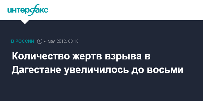 Москва/Махачкала. 4 мая. INTERFAX.RU - В результате взрыва в Дагестане, по предварительным данным, погибло восемь человек, сообщил "Интерфаксу" источник в правоохранительных органах республики.