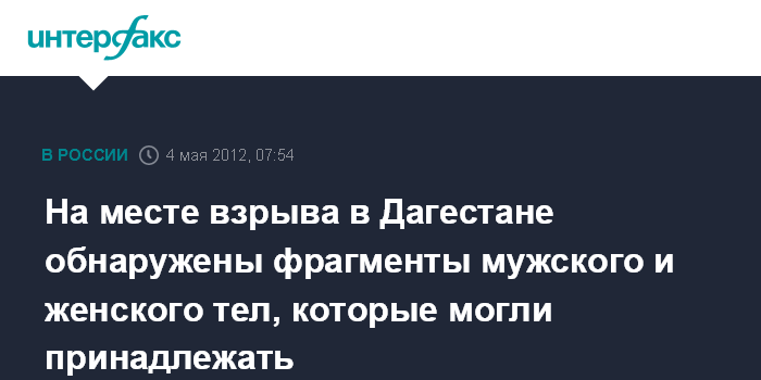 Москва. 4 мая. ИНТЕРФАКС - В ходе осмотра места двойного теракта в Махачкале обнаружены несколько фрагментов мужского и женского тел, которые могли, как считают эксперты, указывать на то, что это останки от террористов-смертников, сообщили "Интерфаксу" в правоохранительных органах в пятницу.