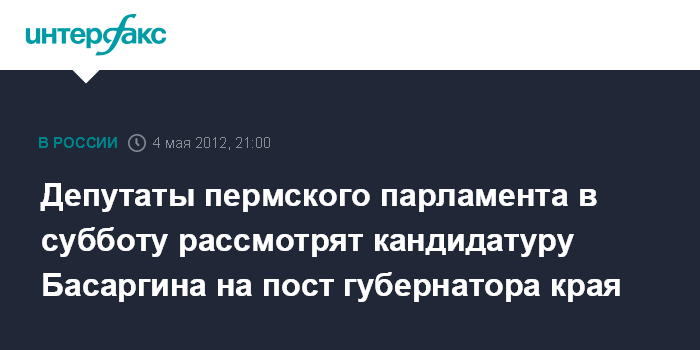 Пермь. 4 мая. INTERFAX.RU - Внеочередное заседание Законодательного собрания Пермского края состоится в субботу, 5 мая, на нем будет рассмотрена кандидатура Виктора Басаргина, предложенная президентом Дмитрием Медведевым на пост главы региона, сообщил "Интерфаксу" источник в правительстве края.