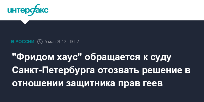 Лондон. 5 мая. INTERFAX.RU - Международная правозащитная организация "Фридом хаус" выступила с призывом незамедлительно отозвать решение суда в Санкт-Петербурге о признании виновным защитника прав геев Николая Алексеева, который был признан виновным в пропаганде гомосексуализма и оштрафован на 5 тыс. рублей.