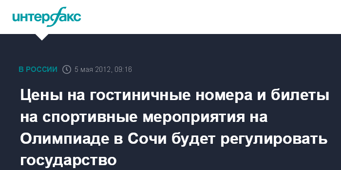 Москва. 5 мая. INTERFAX.RU - Правительство сможет регулировать цены билетов на олимпийские состязания в Сочи, а также не допустит спекулятивного завышения стоимости гостиничных номеров в период Олимпиады-2014, пишет газета "Ведомости" в субботу.