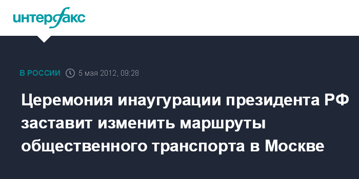 Москва. 5 мая. INTERFAX.RU - ГУП "Мосгортранс" изменяет маршруты движения наземного общественного транспорта 7 мая в связи церемонией инаугурации президента РФ.