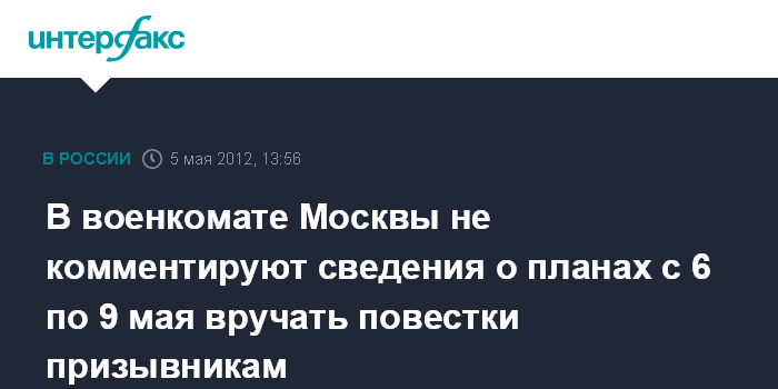 Москва. 5 мая. INTERFAX.RU - В военкомате Москвы не стали подтверждать, но и не опровергли информацию о предстоящем массовом вручении повесток призывникам-москвичам и гостям столицы, которые будут задержаны полицией на улицах города в период с 6 по 9 мая.