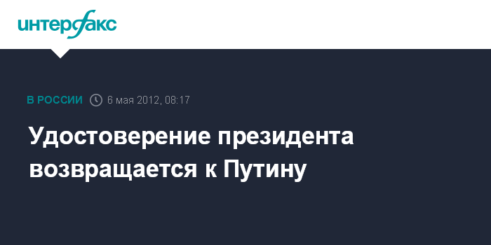 Москва. 6 мая. ИНТЕРФАКС - Удостоверение президента РФ, как ожидается, будет вручено в воскресенье избранному главой государства Владимиру Путину.