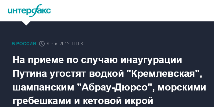 Москва. 6 мая. INTERFAX.RU - На приеме по случаю инаугурации президента России Владимира Путина с участием около тысячи человек будут угощать отечественными напитками и изысканными блюдами национальной кухни.