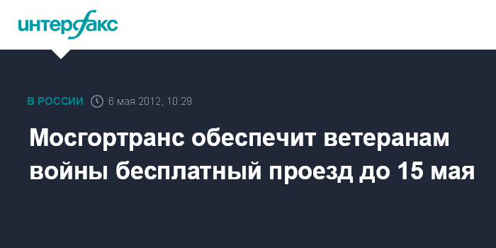 Москва. 6 мая. INTERFAX.RU - Все ветераны Великой Отечественной войны, прибывающие в Москву из регионов РФ и стран СНГ для участия в мероприятиях, посвященных празднованию 67-й годовщины Победы, смогут ездить на московских автобусах, троллейбусах и трамваях бесплатно до 15 мая.
