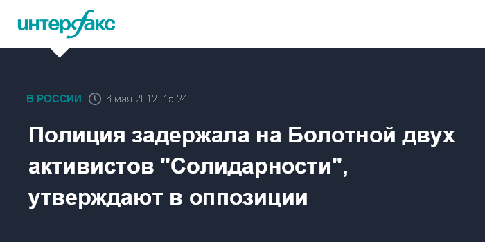 Москва. 6 мая. INTERFAX.RU - Двое активистов "Солидарности" задержаны полицией в воскресенье в центре Москвы, сообщил "Интерфаксу" пресс-секретарь оппозиционного движения Ольга Шорина. "Двое активистов "Солидарности" задержаны полицией на Болотной площади, где готовилась сцена для митинга", - сказала она.
