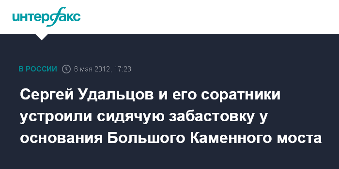 Москва. 6 мая. INTERFAX.RU – Сергей Удальцов призвал участников "Марша миллионов" устроить сидячую забастовку против закрытого входа на Большой Каменный мост. Люди начали садиться на асфальт перед кинотеатром "Ударник", среди них Удальцов, Навальный, Яшин.