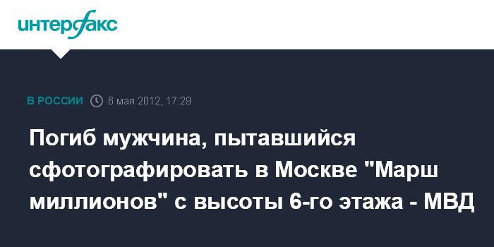 Москва. 6 мая. INTERFAX.RU - Мужчина, фотографировавший "Марш миллионов" в Москве, погиб, упав с пожарной лестницы дома на Большой Якиманке, сообщили "Интерфаксу" в пресс-службе ГУ МВД России по Москве. "Около 16.30 неизвестный мужчина с фотоаппаратом полез по пожарной лестнице дома 35 по улице Большая Якиманка. На уровне 5-6 этажей он сорвался и от полученных травм скончался на месте", - сказал представитель пресс-службы.