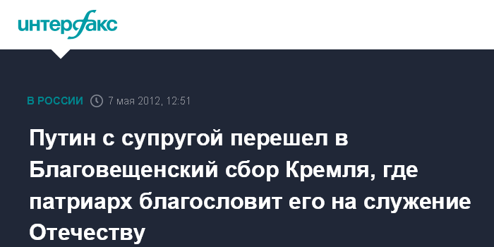 Москва. 7 мая. INTERFAX.RU - Владимир Путин, который в понедельник вступил в должность президента России, после смотра Президентского полка на Соборной площади перешел в Благовещенский собор, где патриарх Московский и всея Руси Кирилл служит молебен на служение Отечеству. Президент РФ направился в собор вместе супругой.