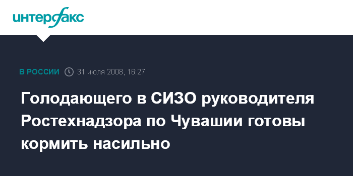 Москва. 31 июля. INTERFAX.RU - В прокуратуре Чувашии заявили, что находящегося в СИЗО руководителя Ростехнадзора по Чувашии Сергея Некряченко могут начать кормить насильно, если он не прекратит голодовку добровольно.