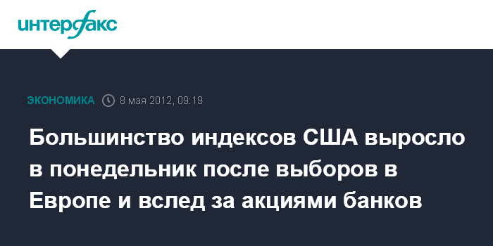 Нью-Йорк. 8 мая. INTERFAX.RU - Большинство американских фондовых индексов выросло по итогам торгов в понедельник после наиболее стремительного с начала этого года недельного падения. Основными причинами роста на фондовом рынке стали результаты выборов во Франции, а также повышение стоимости акций компаний банковского сектора.