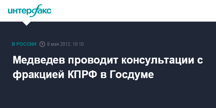Москва. 8 мая. INTERFAX.RU - В Госдуме во вторник начались консультации кандидата в премьеры России Дмитрия Медведева с фракцией компартии. Накануне подобные консультации прошли с "Единой Россией" и ЛДПР. Ожидается, что после завершения встречи с коммунистами Д.Медведев проведет консультации с эсерами.