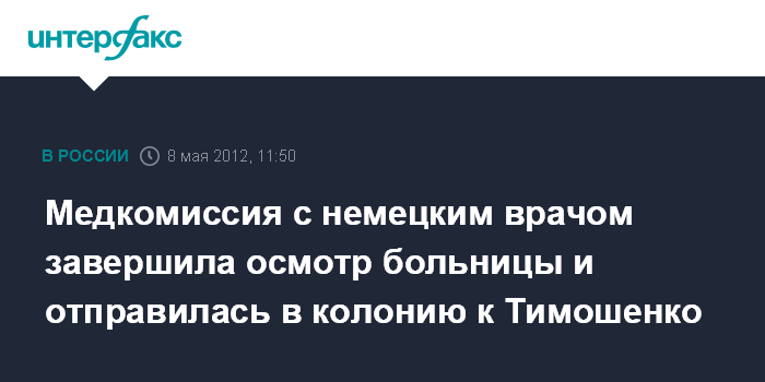 Харьков. 8 мая. INTERFAX.RU - Медицинская комиссия во главе с первым заместителем министра здравоохранения Украины Раисой Моисеенко осмотрела больничный блок Центральной клинической больницы №5 "Укрзализныци", в котором предполагается лечить экс-премьера Юлию Тимошенко. Главврач ЦКБ №5 Михаил Афанасьев сообщил журналистам, что представитель берлинской клиники "Шарите" присутствовал во время осмотра, но не давал никаких оценок оборудованию и условиям содержания больных.