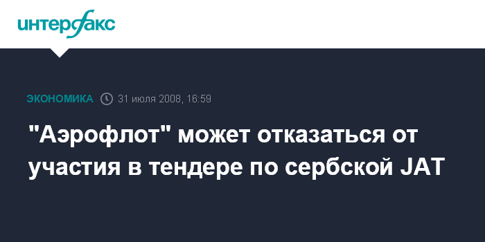 Москва. 31 июля. INTERFAX.RU - ОАО "Аэрофлот - российские авиалинии" может отказаться от участия в тендере по приобретению госпакета акций сербского государственного авиаперевозчика JAT, сообщила "Интерфаксу" руководитель пресс-службы авиакомпании Ирина Данненберг.