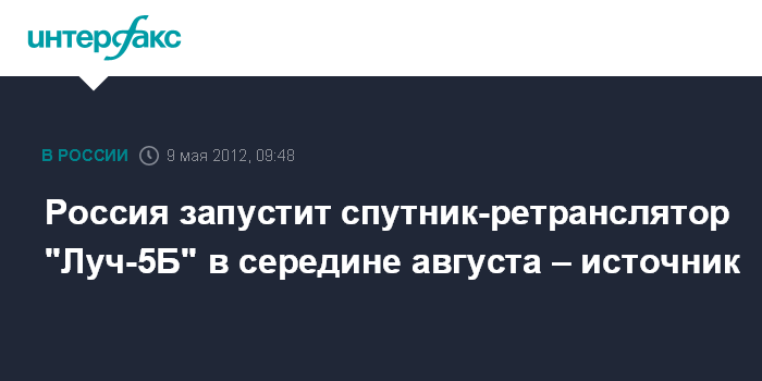 Москва. 9 мая. ИНТЕРФАКС-АВН - Очередной новейший российский спутник-ретранслятор серии "Луч-5" планируется вывести на орбиту в конце лета 2012 года, сообщил "Интерфаксу-АВН" источник в ракетно-космической отрасли.