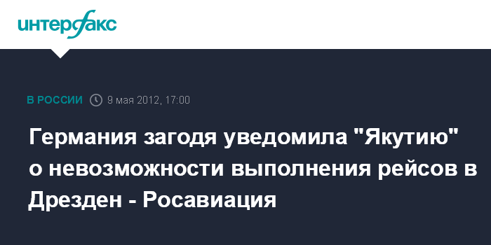 Москва. 9 мая. INTERFAX.RU - Авиационные власти Германии заранее предупреждали авиакомпанию "Якутия" о невозможности выполнения рейсов в Дрезден, однако перевозчик не принял никаких мер и не проинформировал авиационные власти России об этом решении, заявил "Интерфаксу" советник руководителя Росавиации Сергей Извольский. "В результате переговоров с авиавластями Германии согласованы все чартерные рейсы авиакомпании "Якутия" на 9 мая", - сообщил С.Вольский.