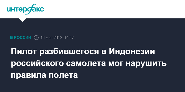 Джакарта. 10 мая. INTERFAX.RU - Российский самолет "Сухой Суперджет-100" разбился в Индонезии по вине пилота, нарушившего требования высоты полета в районе гор, башен и высотных зданий, заявил в четверг один из опытнейших пилотов местной авиакомпании Merpati Nusantara Airlines Ронни Роснади.