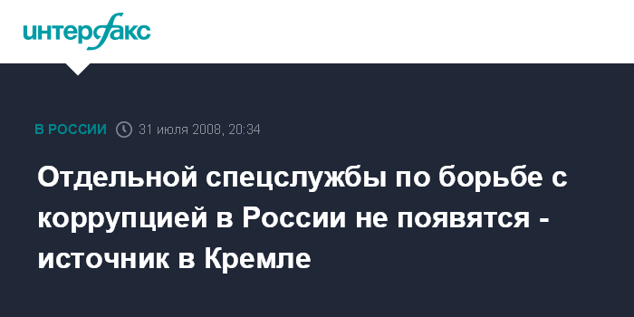 Москва. 31 июля. ИНТЕРФАКС - В России не планируется создавать отдельное ведомство, которые будет заниматься вопросами борьбы с коррупцией, сообщил в четверг "Интерфаксу" источник в Кремле.