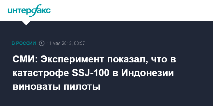 Москва. 11 мая. INTERFAX.RU - Российские авиационные эксперты смоделировали последний полет разбившегося в среду в Индонезии самолета Sukhoi SuperJet 100 (SSJ-100), эксперимент показал, что причиной катастрофы стал человеческий фактор, пишут "Известия" в пятницу.
