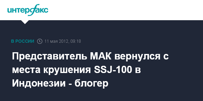 Москва. 11 мая. INTERFAX.RU - Представитель Авиационного регистра Международного авиационного комитета (АР МАК) вернулся с места падения самолета Sukhoi SuperJet 100, разбившегося в Индонезии, сообщил блогер Сергей Доля.