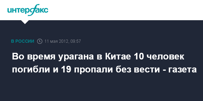 Пекин. 11 мая. INTERFAX.RU - 10 человек погибли и 19 пропали без вести во время урагана, обрушившегося на округ в северо-западной китайской провинции Ганьсу, сообщает газета The China Daily в пятницу.