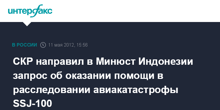 Москва. 11 мая. INTERFAX.RU - Глава Следственного комитета РФ Александр Бастрыкин обратился в Минюст Индонезии с просьбой о содействии в расследовании уголовного дела по факту крушения российского самолета Sukhoi Superjet 100, сообщил официальный представитель ведомства Владимир Маркин.